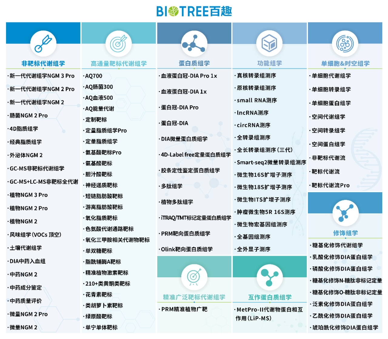 经过十多年的发展,公司目前已建立了完善的代谢组学平台,包括非靶标代谢组学、高通量靶标代谢组学、脂质组学、广泛靶标代谢组学、代谢流检测,高通量单细胞代谢组学,空间代谢组学等,同时建立了蛋白质组学平台和抗体测序等检测分析平台。